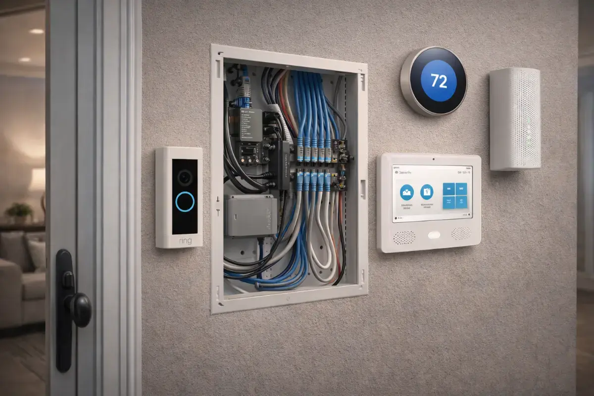 Including Ring™ doorbells, smart thermostats, and low‑voltage integrations. Our team routes structured cabling for seamless home automation across devices.